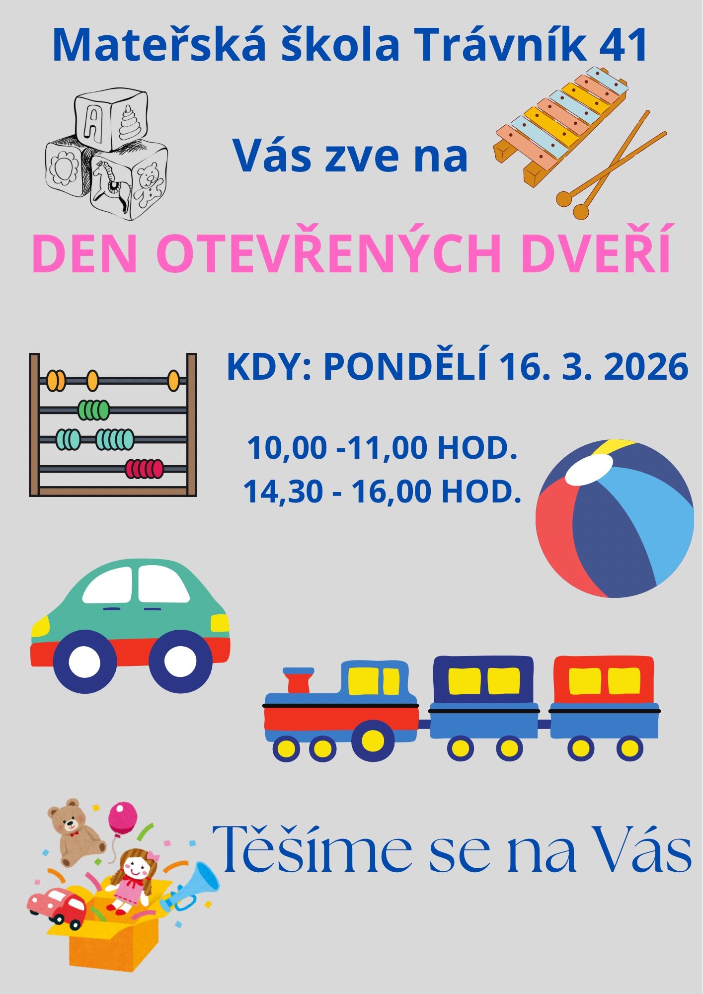 V pondělí 16. 3. 2026 dopoledne od 10:00 hod. do 11:00 hod. a odpoledne od 14:30 hod. do 16:00 hod. Rodiče se mohou seznámit s dopoledními i odpoledními vzděl. aktivitami jednotlivých tříd, seznámí se s prostředím MŠ, pedagogickým kolektivem, apod.